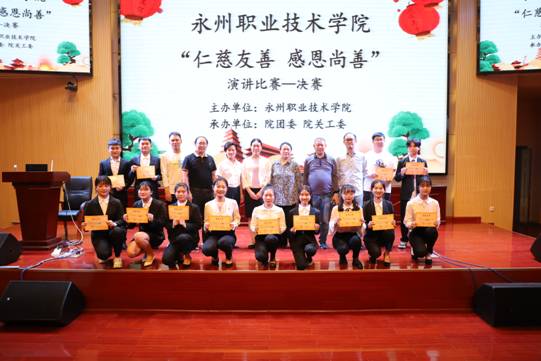 4月25日下午,”仁慈友善感恩尚善“主题演讲比赛决赛在图书馆三楼报告厅隆重举行。学院党委副书记李国春、宣传统战部部长裴有为及相关部门负责人出席了比赛。校关工委常务副主任冯惠先教授、校关工委副主任朱仁华教授、教学督导高职研究室主任张伟副教授、公共课部赵凌峰副教授、校团委副书记唐雪峰担任本次比赛的评委。