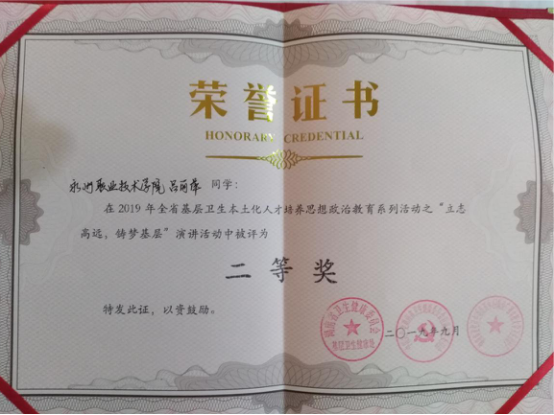 9月26日,由湖南省卫健委主办的“立志高远、铸梦基层”主题演讲赛在岳阳职业技术学院举行,我校15级农村医学中职班学生吕丽萍从11位全省各高职院校选派的选手中脱颖而出,以第三名的成绩荣获二等奖,展现了我校乡医培养的学生良好的精神面貌和素质修养。