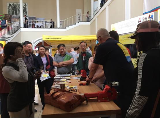 在此期间,学员们还实地参观考察了巴登符腾堡州立“双元制”应用科学大学霍普校区,深入教室、实训室了解了“双元制”大学生的学习和实训的真实情况;考察了德国优秀中小企业Glaeser,了解企业技术人才需求、人才培养以及中国职业院校毕业生在德国企业的发展机会;参观了卡尔斯鲁厄理工大学校区和巴符州职业学校“工业4.0”实验工坊,比较了其在人才培养层次上的区别;实地了解“工业4.0”实验工坊的组建及运行;下到流水线对奔驰载重汽车生产线进行实地考察,观看了一辆奔驰重卡从上线到下线的全过程。最后还参观了弗洛伊登棕榈园养老院、康复医院,了解养老院和康复医院实训的组织和实施、“双元制”学生及员工待遇等情况。学员们还特别参加了弗洛伊登市每年一度的经济区“双元制”学生及毕业生招聘会,在火爆的招聘现场真切地感受和了解到了德国“双元制”职业教育的模式和流程,也切实体会到了“双元制”职业教育与德国企业之间的这种密切合作关系。