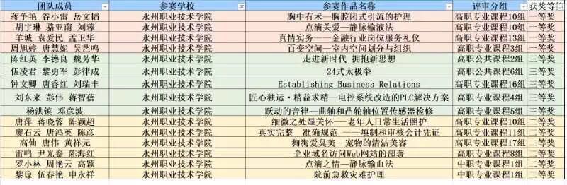 在7月7日结束的2019年湖南省职业院校教师职业能力比赛课堂教学赛项中,永州职业技术学院蒋争艳老师团队、胡宇琳老师团队、周旭婷老师团队、羊城老师团队发挥出色,荣获省赛一等奖。