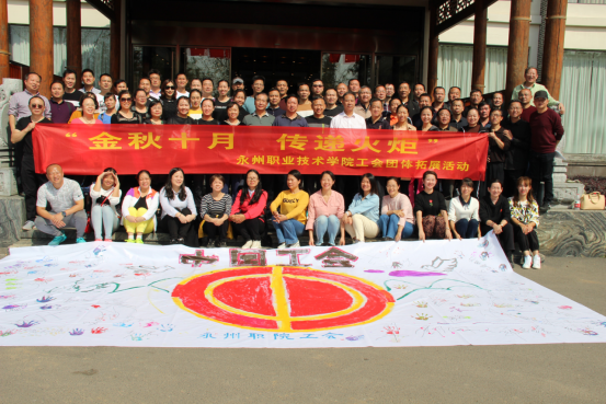 上午九点,风和日丽,素质拓展活动基地——永州祁阳香湖湾,依山傍水,花草吐香。在校党委委员、纪委书记蒋衡湘热情洋溢的致辞中,拓展活动拉开序幕。本次户外拓展联谊活动,形式多样,内容丰富,通过趣味运动会形式,重点开展了“鸿运彩球”、“龟兔赛跑”、“真情碰碰碰”等项目。队员们全身参与,激情投入,挑战自我,在合作中竞争,在竞争中合作。最后一个项目“共绘蓝图”,将活动推向高潮。一块3×4米的画布徐徐展开,多名颇具绘画功底的队员,现场彩绘,象征中国工会和中国工人阶级团结统一的“中国工会会徽”跃然布上,周围是全体队员的签名和手印,构成一幅提气聚力,斑斓而又庄严的生动画卷。