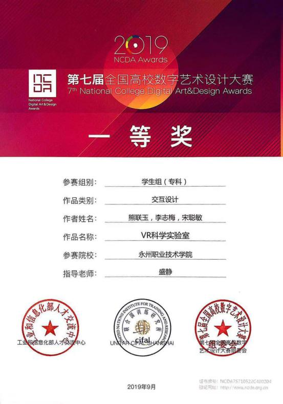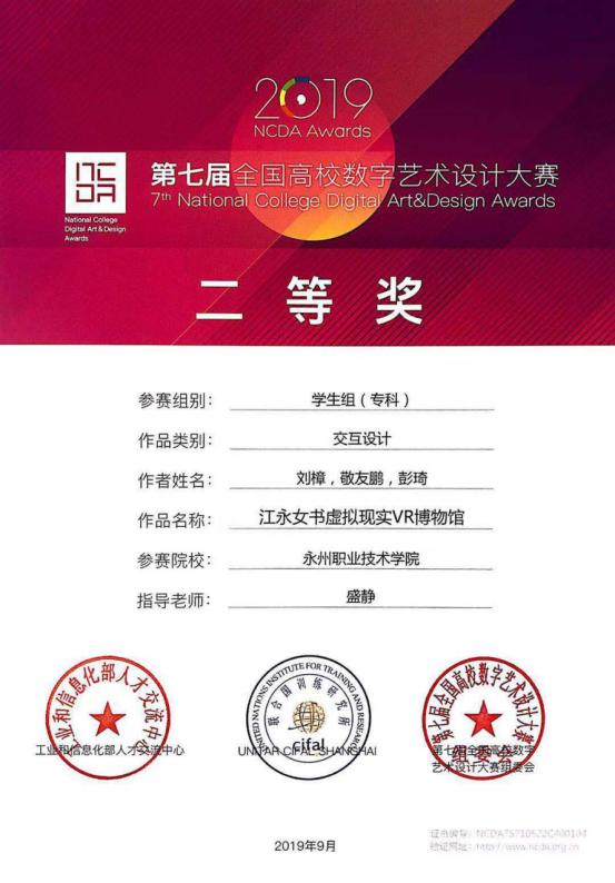 10月19日,第七届艺术设计教育研讨会暨第七届全国高校数字艺术设计大赛颁奖盛典在四川师范大学落下帷幕,永州职业技术学院信息工程学院熊联玉、李志梅、宋聪敏同学的“VR科学实验室”作品获得学生组(专科)一等奖,刘樟、敬友鹏、彭琦同学的“江永女书虚拟现实VR博物馆”获得学生组(专科)二等奖,信息工程学院教师盛静获评优秀指导教师。