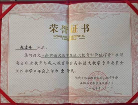 近日,湖南省高职院校语文教学工作交流会在岳阳职业技术学院举行,会上交流了全省语文教学的最新动态、探讨了语文金课打造、语文课程标准建设等问题,并进行了全省语文教学学术论文评比活动,我校公共基础学部赵凌峰老师撰写的《高职语文教学在通识教育中的价值探索》一文荣获一等奖。