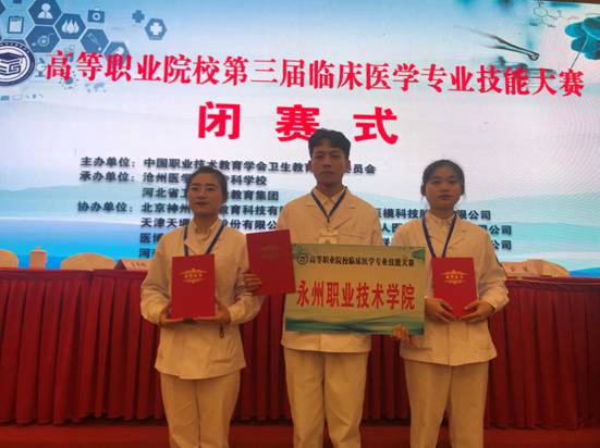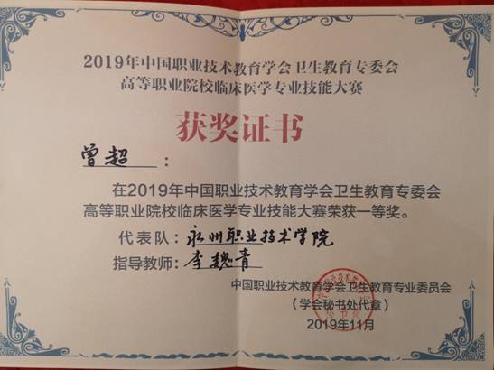 2019年11月24日,从沧州传来喜讯, 在2019年高等职业院校第三届临床医学专业技能大赛中,永州职业技术学院医学院临床医学专业学子曾超、何世明、刘佩香分别获得一、二、三等奖,李魏青老师荣获优秀指导教师奖,这是该校首次获得该赛项一等奖。