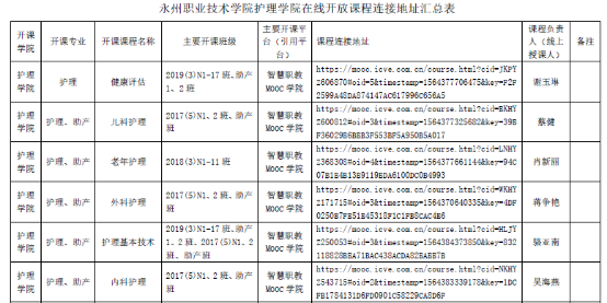 为加强新冠肺炎疫情防控,确保师生生命安全和身体健康,减少疫情对正常教学工作的影响,根据教育部、湖南省教育厅和永州职业技术学院相关文件要求,积极响应教育部“停课不停学”的号召,2月12日护理学院17门在线开放课程(其中8门省级精品在线开放课程)在智慧职教全面上线,供校内、校外护理学专业和助产学专业同学学习。
