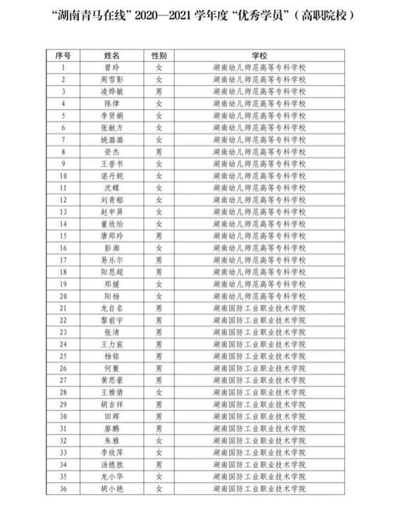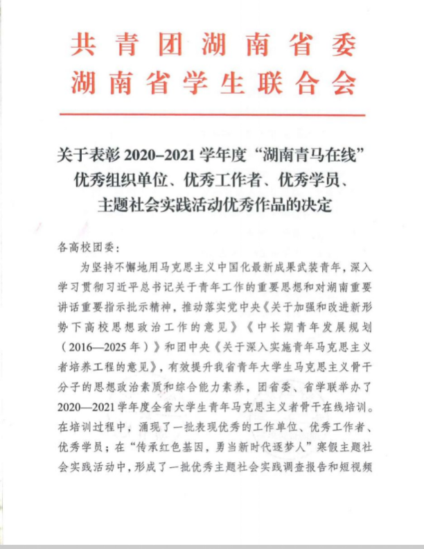 近日,共青团湖南省委、湖南省学生联合会公布了《关于表彰2020-2021学年度“湖南青马在线”优秀组织单位、优秀工作者、优秀学员、主题社会实践活动优秀作品的决定》,我校获评“优秀组织单位”、眭宁艳获评“优秀工作者”、欧阳冰姣等32名同学获评“优秀学员”荣誉称号。