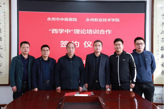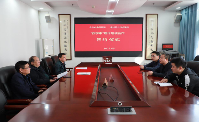 为贯彻落实《湖南省卫生健康委湖南省中医药局关于印发湖南省中医药“神农人才”工程实施方案(2021-2025年)的通知》和《湖南省卫生健康委湖南省中医药局关于组织实施全省“西医学习中医”人才培训项目的通知》等文件精神,有序推进湖南省“西医学习中医”人才培训项目(以下简称“西学中项目”),高质量完成有关工作目标,永州市中医院和我校双方充分发挥各自优势,建立中医药从业人员继续教育全面合作伙伴关系,开展西学中项目线下理论培训合作。3月8日上午,我校翟惠根校长代表学校和永州市中医医院院长邓阳春共同签订了合作协议。