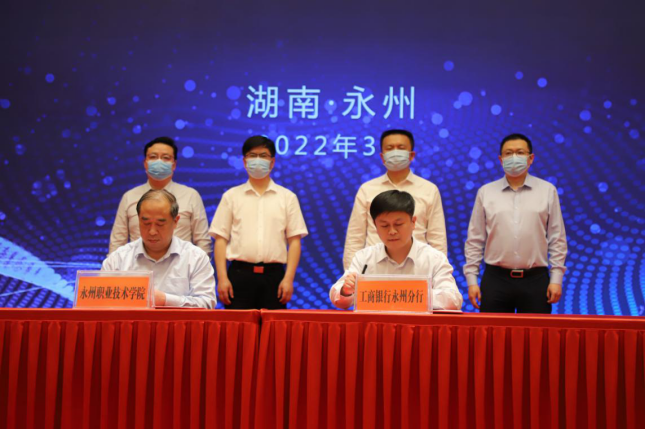 在出席的各级领导及双方参会人员的共同见证下,永州职业技术学院校长翟惠根与中国工商银行永州分行行长杜凌翼签订合作协议。