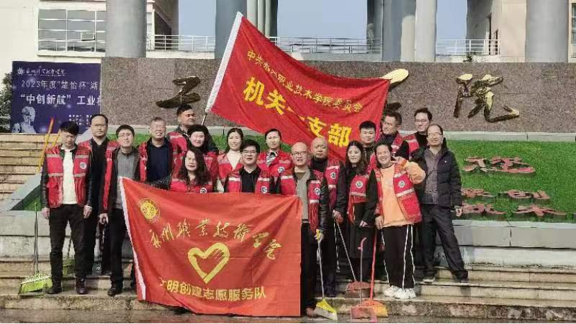 为扎实推进学校文明创建工作,打造整洁有序的校园环境,喜迎2023年度“楚怡杯”湖南省职业院校技能大赛高职组师生工业机器人技术应用赛项在学校开幕,2月28日下午,学校机关一支部党员在学校党委书记黄小明同志的带领下,在校园里开展清洁环境志愿服务活动。