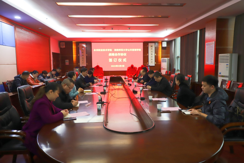 3月3日,永州职业技术学院与湖南师范大学公共管理学院战略合作协议签约仪式在永州职业技术学院举行。永州职业技术学院党委书记黄小明,校党委副书记、校长郑文飞,校党委委员、副校长裴有为,湖南师范大学公共管理学院院长、博士生导师毛新志教授,湖南师范大学公共管理学院副院长胡雪松同志,湖南师范大学社科处副处长、公共管理学院博士生导师李超民等领导出席签约仪式,签约仪式由郑文飞主持。