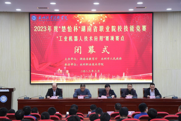 3月5日下午,2023年度“楚怡杯”湖南省职业院校技能大赛工业机器人技术应用赛项在永州职业技术学院圆满闭幕。永州职业技术学院党委副书记、院长郑文飞,赛点第一副主任、湖南现代物流职业技术学院纪委书记胡建昌,湖南农业大学康江教授,省派赛项负责人、衡阳市职业教育和成人教育中心副主任欧瑞华,参赛院校领队,参赛选手及各部门负责人及赛点工作人员共200余人参加了闭幕式。永州职院党委委员、副校长陈强主持闭幕式。