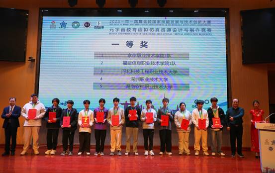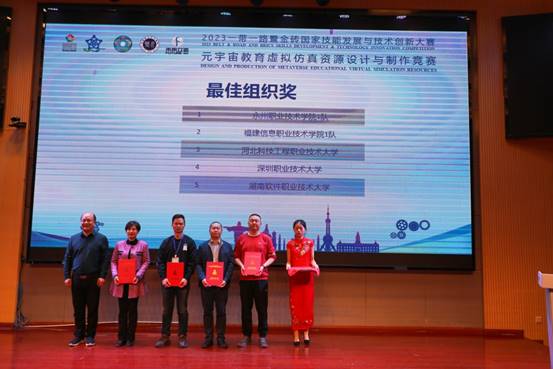 2023一带一路暨金砖国家技能发展与技术创新大赛元宇宙教育虚拟仿真资源设计与制作决赛共有来自全国15个省市38所院校的58支代表队,共249名选手参加。经过两天的激烈角逐,共评选出一等奖5个,二等奖9个,三等奖14个,优秀奖18个。永州职业技术学院1队、福建信息职业技术学院1队、河北科技工程职业技术大学、深圳职业技术大学、湖南软件职业技术大学将一等奖收入囊中。永州职业技术学院获得“突出贡献奖”和“最佳组织奖”。