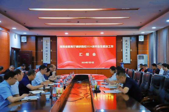 7月1日上午,湖南省2024届高校毕业生就业工作实地调研组组长、省教育厅二级巡视员柴世钦一行4人莅临我校调研指导2024届毕业生就业工作。我校党委书记黄小明,党委副书记、校长郑文飞以及在家的校领导出席会议,相关职能部门负责人及各二级学院党支部书记、招生就业科科长、就业办主任、辅导员代表及招生就业指导处全体工作人员参加了汇报会及座谈会。会议由郑文飞主持。