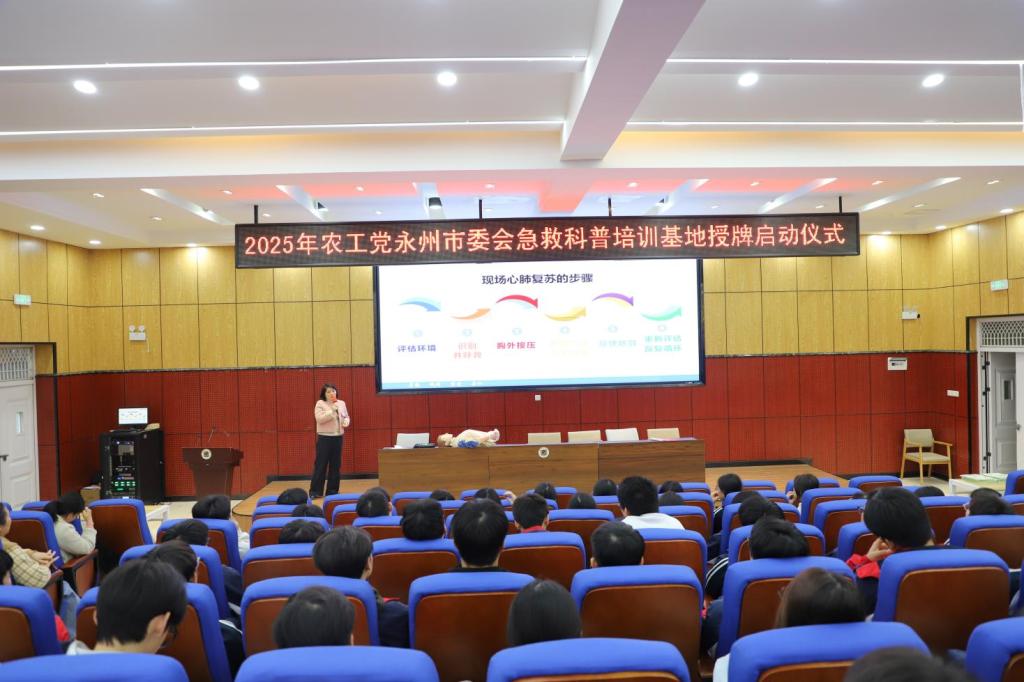 授牌仪式结束后,基地组织了首场面向公众的急救技能公益培训。来自永州市农工党永州职院一支部主委、永州市第一人民医院卢桂云通过理论讲解与模拟实操相结合的方式,为现场学员深入浅出地讲解了心肺复苏(CPR)的操作流程、自动体外除颤器(AED)的使用方法以及气道异物梗阻等常见急症的现场处理。专家讲解细致,学员互动积极,现场气氛热烈。