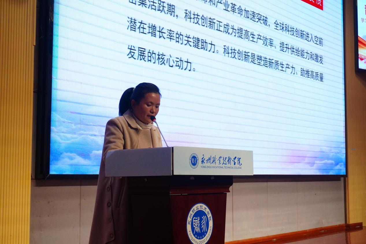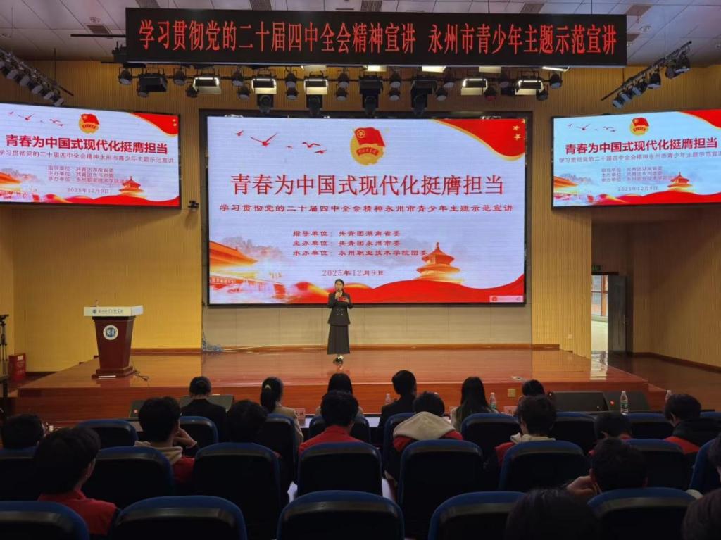 为全面深入学习领会党的二十届四中全会精神,扎实推进学习宣传贯彻工作,引导全市广大青少年把思想和行动统一到全会精神上来,把智慧和力量凝聚到落实全会确定的各项目标任务上来。12月9日,由共青团湖南省委指导、共青团永州市委主办、永州职业技术学院团委承办的“青春为中国式现代化挺膺担当”永州市青少年主题示范宣讲活动在校本部图书馆三楼报告厅顺利举行。共青团永州市委副书记张佳杰、永州职业技术学院团委书记周瑜以及永州职业技术学院青年学生200余人参加了本次活动。