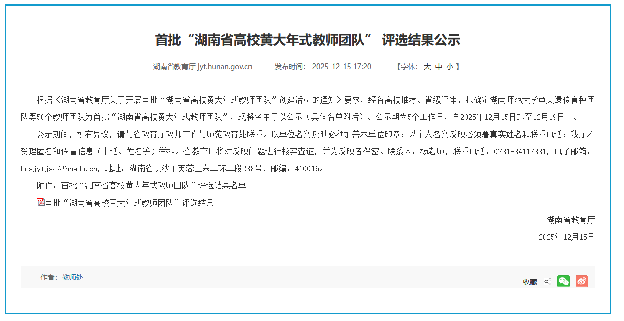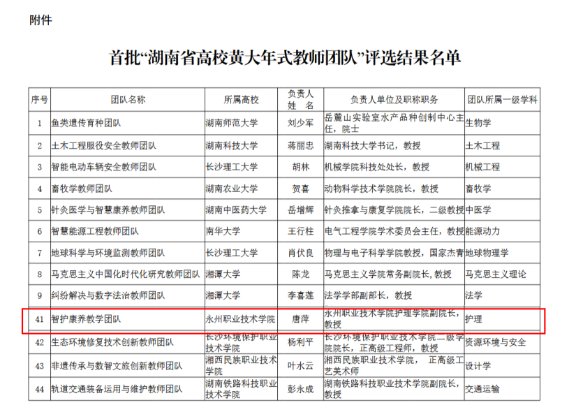 2025年12月15日,湖南省教育厅公示首批“湖南省高校黄大年式教师团队”名单,我校护理学院智护康养教师团队成功入选,成为全省50个获此殊荣的团队之一,这是对我校职业教育师资建设与社会服务成效的重要肯定。