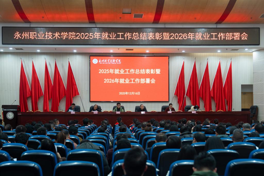 为深入贯彻党中央、国务院关于高校毕业生就业创业工作的决策部署,全面总结2025年就业工作成效,表彰先进典型,精准部署2026年重点任务,12月16日,永州职业技术学院隆重召开2025年就业工作总结表彰暨2026年就业工作安排部署会。学校党委书记黄小明、党委副书记李勇,党委委员、纪委书记宾柱元,党委委员、副校长裴有为,党委委员、宣传统战部部长黄义君,党委委员、组织人事处处长罗素琼,各职能处室、教辅机构正科以上中层干部,二级院部副科以上干部,2025届、2026届毕业班辅导员,招生就业指导处及创新创业中心全体人员参加了会议。会议由党委副书记李勇主持。