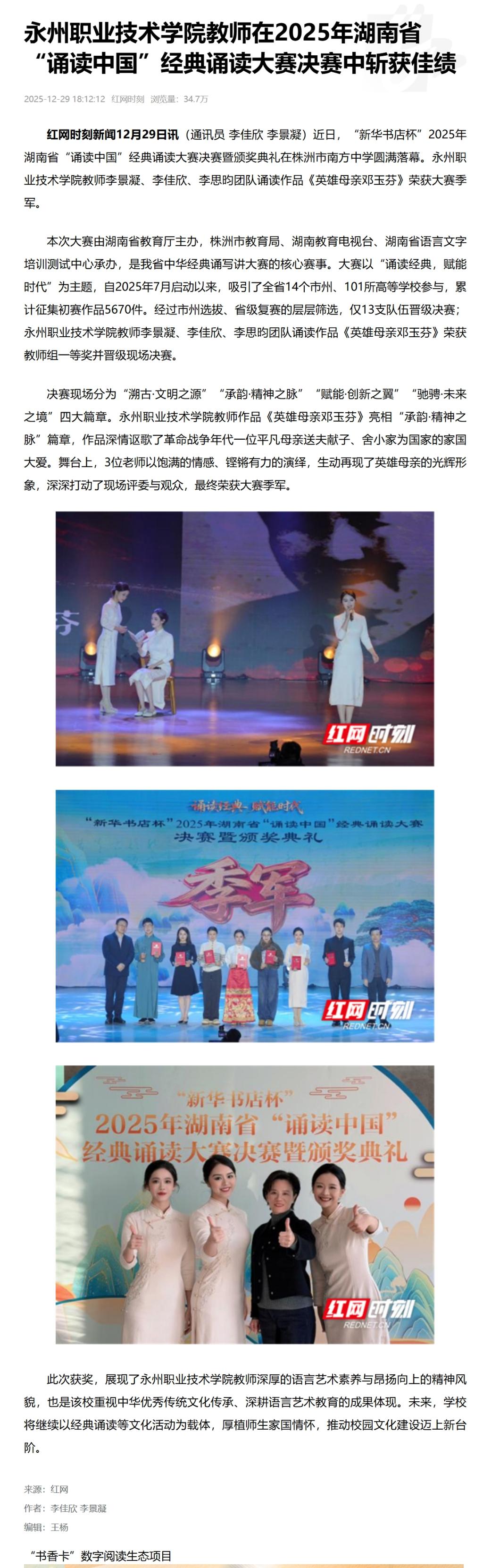 红网时刻新闻12月29日讯(通讯员 李佳欣 李景凝)近日,“新华书店杯”2025年湖南省“诵读中国”经典诵读大赛决赛暨颁奖典礼在株洲市南方中学圆满落幕。永州职业技术学院教师李景凝、李佳欣、李思昀团队诵读作品《英雄母亲邓玉芬》荣获大赛季军。