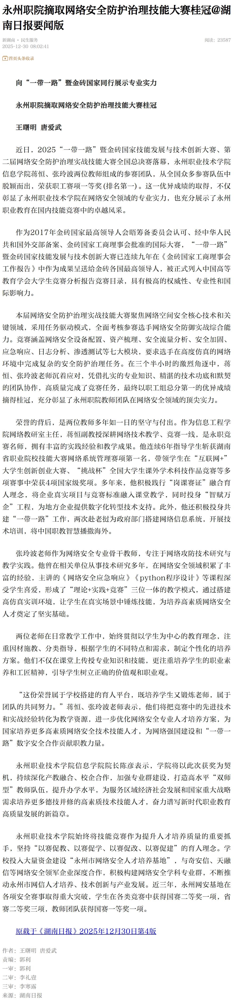 近日,2025“一带一路”暨金砖国家技能发展与技术创新大赛、第二届网络安全防护治理实战技能大赛全国总决赛落幕,永州职业技术学院信息学院蒋恒、张玲波两位教师组成的参赛团队,从全国众多参赛队伍中脱颖而出,荣获职工赛项一等奖(排名第一)。这一优异成绩的取得,不仅彰显了永州职业技术学院在网络安全领域的专业实力,也充分展示了永州职业教育在国内技能竞赛中的卓越风采。