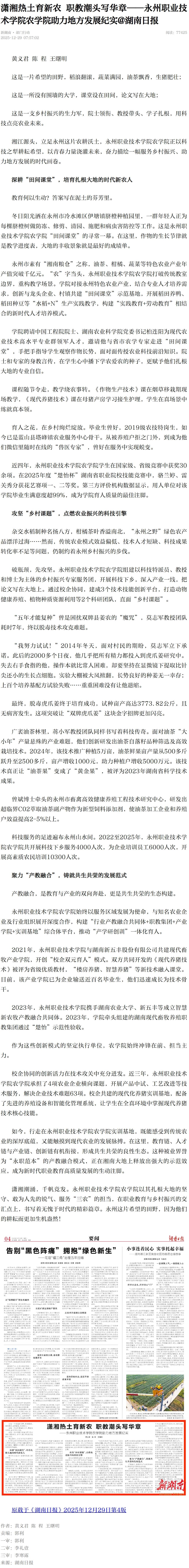 科技服务的足迹遍布永州山水间。2022至2025年,永州职业技术学院农学院共开展科技下乡服务4000人次,为企业培训员工6000人次,开展高素质农民培训10300人次。