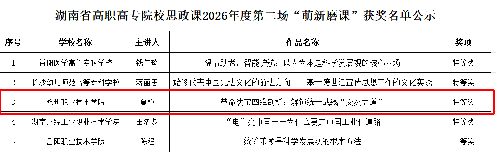 近日,2026年第二场湖南省高职高专院校思政课建设联盟“骨干练兵、萌新磨课”教学竞赛结果正式揭晓,永州职业技术学院马克思主义学院周海兰、夏艳两位老师凭借精湛的教学技艺和新颖的教学设计,双双斩获特等奖,成功拿到全国复赛入场券,将代表湖南省高职高专院校出征全国赛事,为学校和学院赢得荣誉。