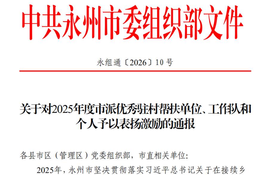 近日,中共永州市委组织部印发《关于对2025年度市派优秀驻村帮扶单位、工作队和个人予以表扬激励的通报》(永组通〔2026〕10号),永州职业技术学院获评“2025年度优秀驻村帮扶单位”,学院驻新田县陶岭镇牛塘村工作队被评为“好”等次驻村帮扶工作队,工作队队长、学院资产管理处副处长刘伯冲同志荣获“优秀驻村帮扶个人”称号。