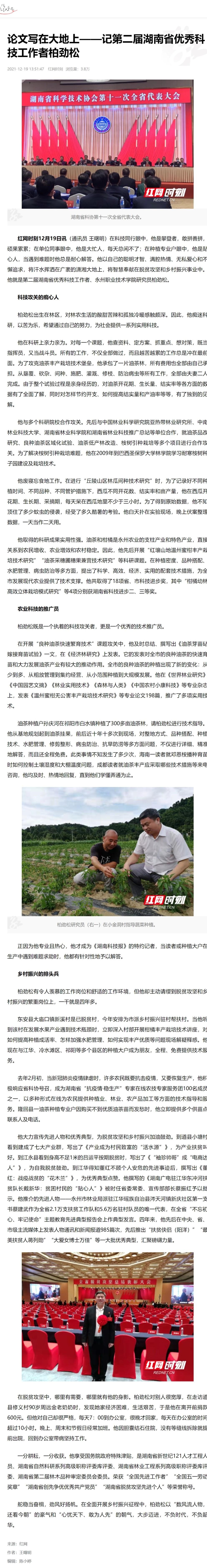 红网时刻12月19日讯(通讯员 王曙明)在科技同行眼中,他是攀登者,敢拼善拼,硕果累累;在单位同事眼中,他是大忙人,每天总闲不了;在种植专业户眼中,他是贴心人,当遇到难题时他总是耐心解答。他以自己的聪明才智、满腔热情、无私爱心和不懈追求,将汗水挥洒在广袤的潇湘大地上,将智慧奉献在脱贫攻坚和乡村振兴事业中。他就是第二届湖南省优秀科技工作者、永州职业技术学院研究员柏劲松。科技攻关的痴心人柏劲松出生在林区,对林农生活的酸甜苦辣和孤独冷暖感触颇深。因此,他痴迷科研,以苦为乐,希望通过自己的努力,为社会提供一系列实用科技。他在科研上亲力亲为。对每一个课题,他查资料、定方案、抓重点、想对策,既当指挥员,又当战斗员。所有的工作,不仅全部做过,而且越苦越累的工作总是冲在最前面。为了攻克油茶丰产栽培技术堡垒,他承包了一片油茶林,所有费用也全部由自己承担。从垦覆、砍杂、间种、施肥、灌溉、修枝、防治病虫等所有工作,全部由夫妻二人完成。由于整个试验过程是亲身经历的,对油茶开花期、生长量、结实率等各方面的数据有了全面了解,同时对怎样节约开支、如何提高结实量和产油率等等,有了独到的见解。他与多个科研院校合作攻关。先后与中国林业科学研究院亚热带林业研究所、中南林业科技大学、湖南省林业科学院和湖南省林业科技推广总站等单位合作,就油茶品改研究、良种油茶区域化试验、油茶低产林改造、桉树引种栽培等多个项目进行合作攻关。为了解决桉树引种栽培难题,他在2009年到巴西圣保罗大学林学院学习耐寒桉树种子园建设及栽培技术。他废寝忘食地工作。在进行“丘陵山区林瓜间种技术研究”时,为了记录好不同种植时间、不同品种、不同管护措施下,西瓜不同开花数、结实率和亩产量,他在西瓜开花期、生长期、采摘期,每天呆在西瓜地里不少于三小时。为了得到原始数据,他不知顶住了多少蚊虫的侵袭,经受了多久酷暑的考验。他白天扑在实验现场,晚上伏案整理数据,一天当作二天用。他取得的科研成果实用性强。油茶和柑橘是永州农业的支柱产业和特色产业,直接关系到农民增收、农业增效和农村稳定。因此,他先后开展“红壤山地温州蜜柑丰产栽培技术研究”“油茶采穗圃穗果兼营技术研究”等科研课题。在种植密度、品种搭配、水肥管理、病虫防治等多方面,提出了科学、高效、经济、实用的配套技术措施,为全市发展现代农业提供了技术支撑。他共取得了18项省、市科技进步奖,其中“柑橘幼林高效立体栽培模式研究”等4项分别获湖南省科技进步二、三等奖。农业科技的推广员柏劲松既是一个执着的科技攻关者,更是一个优秀的技术推广员。在开展“良种油茶快速繁育技术”课题攻关中,他及时总结、撰写出《油茶芽苗砧嫁接育苗试验》一文,在《经济林研究》上发表。它的发表对全市的良种油茶的快速育苗和大力发展油茶产业有较大的推动作用。全市的良种油茶的种植出现了新的变化:从少到多、从粗放管理到集约经营、从小范围种植到大规模发展。他在《世界林业研究》《中国园艺文摘》《林业实用技术》《森林与人类》《中国农村小康科技》等专业杂志上,发表《温州蜜柑无公害丰产栽培技术研究》等专业论文198篇,推广了多项实用技术。油茶种植户孙庆河在祁阳市白水镇种植了300多亩油茶林,请柏劲松进行技术指导。他从基地规划起到油茶挂果,前后近十年十多次到现场,对整地方式、品种搭配、种植技术、水肥管理、修剪整形、病虫防治、抗旱防涝等多方面问题,不仅进行详细、精准地解答,而且还全程免费。此类事情不知发生了多少次,海南一读者就邓恩桉播种育苗时如何控制土壤湿度和大棚温度问题,成都读者就油茶丰产应采取哪些技术措施等来电咨询,他均及时、热情地回复,直到他们学懂弄通为止。正因为他专业且热心,他才成为《湖南科技报》的特约记者,当读者或种植大户在生产中遇到难题求助时,他都有针对性地予以解答。乡村振兴的排头兵柏劲松有令人羡慕的工作岗位和舒适的工作环境,但他却主动请缨到脱贫攻坚和乡村振兴的繁重岗位上,一干就是四年多。东安县大庙口镇新溪村是已脱贫村,今年安排为市派乡村振兴驻村帮扶村。当他听到该村在发展水果产业遇到技术瓶颈时,立即深入村部开展柑橘丰产栽培技术讲座,对如何提高种植成活率、怎样加强水肥管理、如何实现丰产优质等问题现场解疑释惑。他现在与江华、冷水滩区、祁阳等多个县区的种植大户成为朋友,全程、免费提供技术服务。去年2月初,当新冠肺炎疫情肆虐时,许多农民既要抗击疫情,又要恢复生产,他积极响应省科协号召,成为湖南省“抗疫情·稳生产”专家在线农技专家服务团100名成员之一,以多种形式在线为农民提供种植业、林业、农产品加工等方面的技术指导和服务。隆回县一油茶种植专业户因购买不到优质油茶苗而发愁时,他立即提供多个供苗点联系人及电话。他大力宣传先进人物和优秀典型,为脱贫攻坚和乡村振兴加油鼓劲。到道县小塘村看到建成了七大产业群,写出了《产业成为村民致富的“活水源”》,为产业扶贫叫好。到江永县看到身高不足1米的吕运平按期脱贫时,写出了《“袖珍帅哥”成“电商达人”》,为自我脱贫鼓劲。到江华得