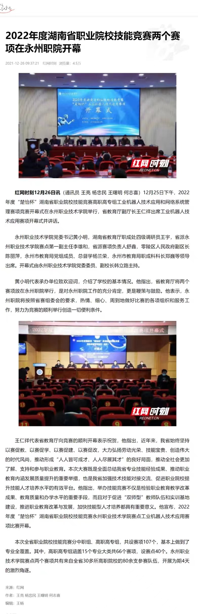 红网时刻12月26日讯(通讯员 王亮 杨忠民 王曙明 何志喜)12月25日下午,2022年度“楚怡杯”湖南省职业院校技能竞赛高职高专组工业机器人技术应用和网络系统管理赛项竞赛开幕式在永州职业技术学院举行,省教育厅副厅长王仁祥出席工业机器人技术应用赛项开幕式并讲话。永州职业技术学院党委书记黄小明,湖南省教育厅职成处四级调研员王宇,省派永州职业技术学院赛点第一副主任李雄和,省派赛项负责人舒鑫,零陵区人民政府副区长陈丽萍,永州市教育局党组成员、总督学杨兰荣,永州市教育局职成科科长郑巍等领导出席。开幕式由永州职业技术学院党委委员、副校长韩立路主持。黄小明代表承办单位致欢迎词,介绍了学校的基本情况。他指出,省教育厅将两个赛项放在永州职院举行,是对永州职院工作的充分肯定,更是鞭策与鼓励。他表示,永州职院将按照省赛组委会的要求,热情、细心、周到地做好比赛的各项组织和服务工作,努力为竞赛的顺利举行创造一切便利条件。王仁祥代表省教育厅向竞赛的顺利开幕表示祝贺,他指出,近年来,我省始终坚持以赛促教、以赛促学、以赛促建、以赛促改,大力弘扬劳动光荣、技能宝贵、创造伟大的时代风尚,推动形成“人人皆可成才、人人尽展其才”的良好局面,推动全社会更加了解、支持和参与职业教育。本次大赛既是全面总结我省专业技能经验成果、推动职业教育内涵发展质量提升的重要举措,也是我省加强技术技能对接交流、促进职业院校提升技能人才培养水平的有效平台。他指出,举办技能竞赛不仅是检验职业教育教学改革成果、教育质量和办学水平的重要手段,而且对于促进“双师型”教师队伍和实训基地建设,推进职业教育改革与发展,加快技能型人才培养都具有重要意义。他宣布,2022年度“楚怡杯”湖南省职业院校技能竞赛永州职业技术学院赛点工业机器人技术应用赛项比赛开幕。本次全省职业院校技能竞赛分中职组、高职高专组,共设赛项107个,基本上做到了专业全覆盖。其中,高职高专组涵盖15个专业大类共66个赛项,设赛点40个。永州职业技术学院赛点两个赛项共有来自全省30多所高职院校的80余支参赛队伍,开展为期4天的激烈角逐。