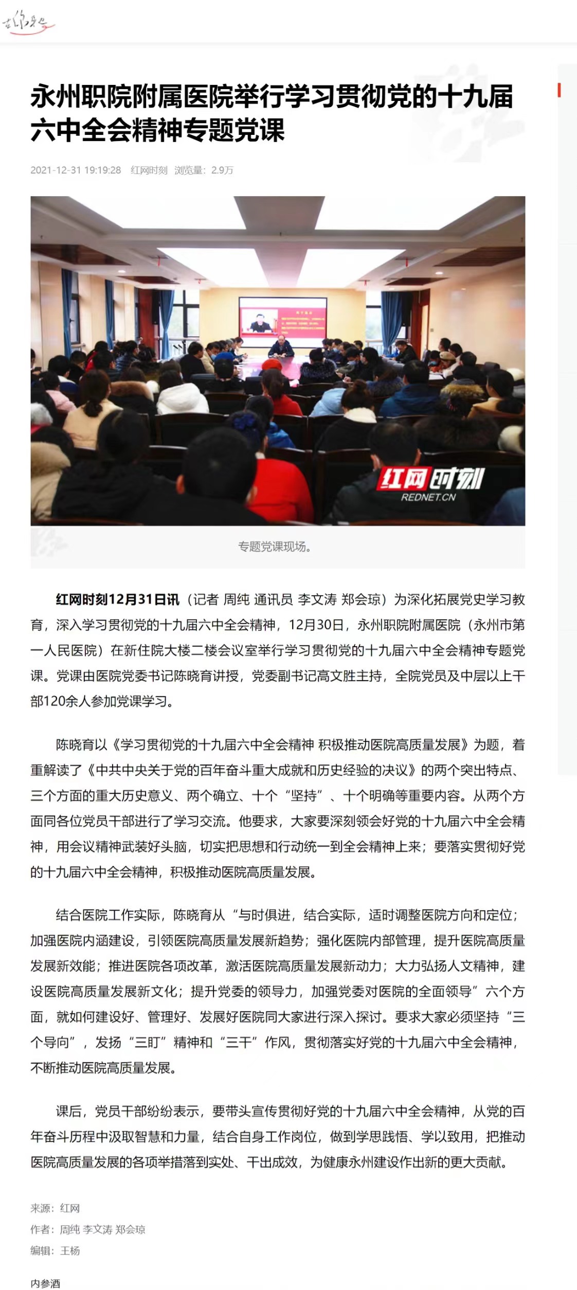 红网时刻12月31日讯(记者 周纯 通讯员 李文涛 郑会琼)为深化拓展党史学习教育,深入学习贯彻党的十九届六中全会精神,12月30日,永州职院附属医院(永州市第一人民医院)在新住院大楼二楼会议室举行学习贯彻党的十九届六中全会精神专题党课。党课由医院党委书记陈晓育讲授,党委副书记高文胜主持,全院党员及中层以上干部120余人参加党课学习。陈晓育以《学习贯彻党的十九届六中全会精神 积极推动医院高质量发展》为题,着重解读了《中共中央关于党的百年奋斗重大成就和历史经验的决议》的两个突出特点、三个方面的重大历史意义、两个确立、十个“坚持”、十个明确等重要内容。从两个方面同各位党员干部进行了学习交流。他要求,大家要深刻领会好党的十九届六中全会精神,用会议精神武装好头脑,切实把思想和行动统一到全会精神上来;要落实贯彻好党的十九届六中全会精神,积极推动医院高质量发展。结合医院工作实际,陈晓育从“与时俱进,结合实际,适时调整医院方向和定位;加强医院内涵建设,引领医院高质量发展新趋势;强化医院内部管理,提升医院高质量发展新效能;推进医院各项改革,激活医院高质量发展新动力;大力弘扬人文精神,建设医院高质量发展新文化;提升党委的领导力,加强党委对医院的全面领导”六个方面,就如何建设好、管理好、发展好医院同大家进行深入探讨。要求大家必须坚持“三个导向”,发扬“三盯”精神和“三干”作风,贯彻落实好党的十九届六中全会精神,不断推动医院高质量发展。课后,党员干部纷纷表示,要带头宣传贯彻好党的十九届六中全会精神,从党的百年奋斗历程中汲取智慧和力量,结合自身工作岗位,做到学思践悟、学以致用,把推动医院高质量发展的各项举措落到实处、干出成效,为健康永州建设作出新的更大贡献。来源:红网作者:周纯 李文涛 郑会琼编辑:王杨