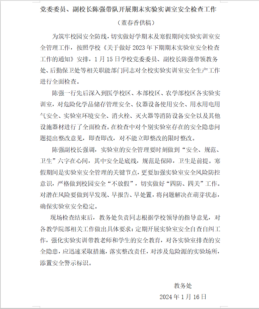 为筑牢校园安全防线,切实做好学期末及寒假期间实验实训室安全管理工作,按照学校《关于做好2023年下期期末实验室安全检查工作的通知》安排,1月15日学校党委委员、副校长陈强带领教务处、后勤保卫处等相关职能部门同志对全校实验实训室安全生产工作进行全面检查。