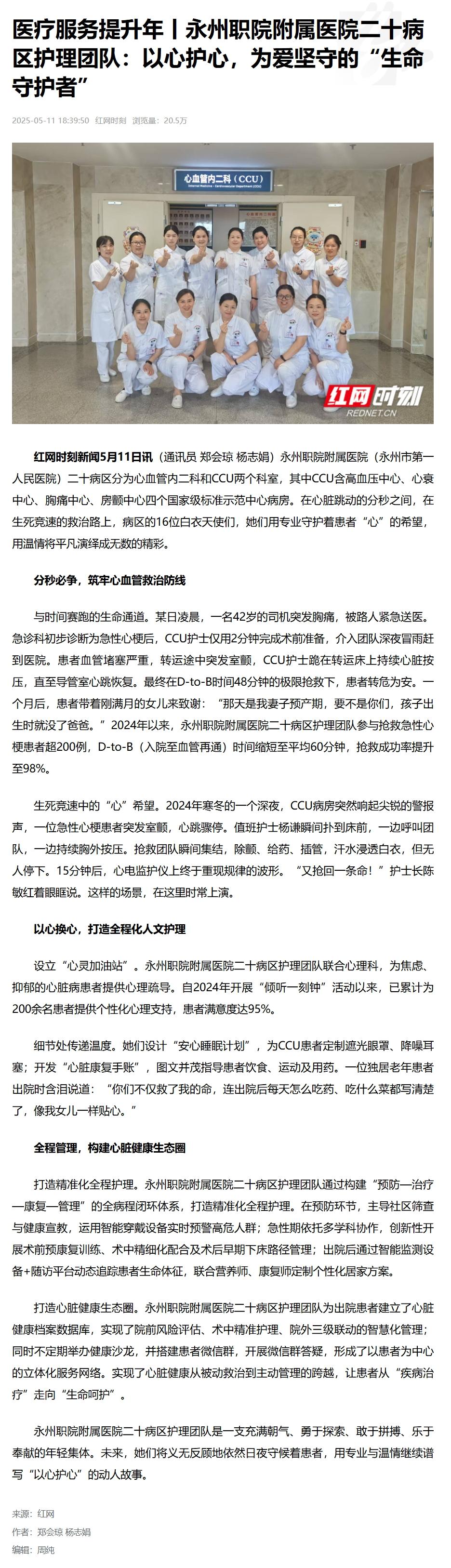 红网时刻新闻5月11日讯(通讯员 郑会琼 杨志娟)永州职院附属医院(永州市第一人民医院)二十病区分为心血管内二科和CCU两个科室,其中CCU含高血压中心、心衰中心、胸痛中心、房颤中心四个国家级标准示范中心病房。在心脏跳动的分秒之间,在生死竞速的救治路上,病区的16位白衣天使们,她们用专业守护着患者“心”的希望,用温情将平凡演绎成无数的精彩。