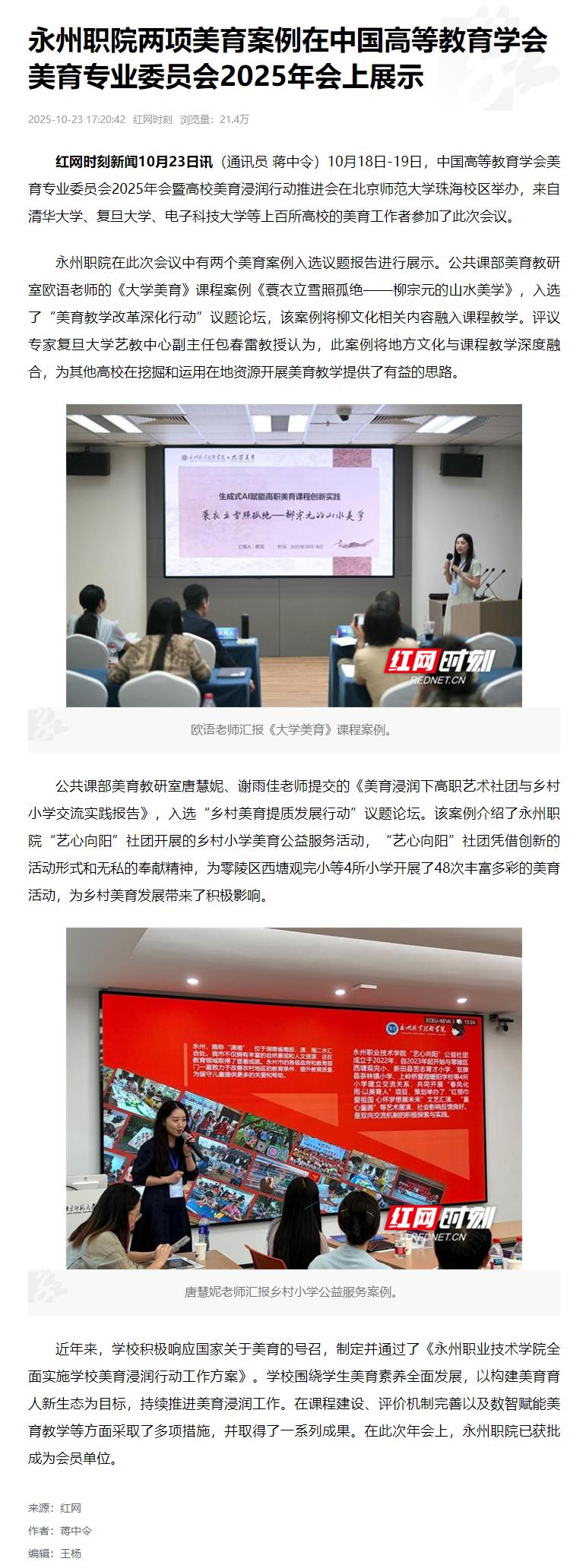 永州职院在此次会议中有两个美育案例入选议题报告进行展示。公共课部美育教研室欧语老师的《大学美育》课程案例《蓑衣立雪照孤绝——柳宗元的山水美学》,入选了“美育教学改革深化行动”议题论坛,该案例将柳文化相关内容融入课程教学。评议专家复旦大学艺教中心副主任包春雷教授认为,此案例将地方文化与课程教学深度融合,为其他高校在挖掘和运用在地资源开展美育教学提供了有益的思路。