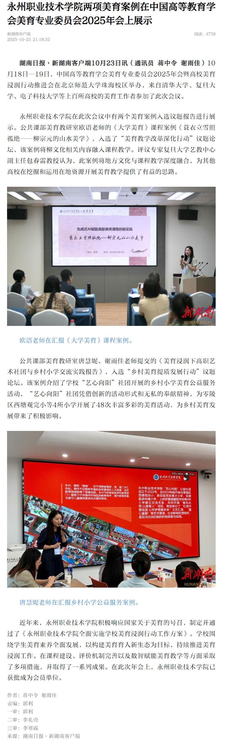 永州职业技术学院在此次会议中有两个美育案例入选议题报告进行展示。公共课部美育教研室欧语老师的《大学美育》课程案例《蓑衣立雪照孤绝——柳宗元的山水美学》,入选了“美育教学改革深化行动”议题论坛,该案例将柳文化相关内容融入课程教学。评议专家复旦大学艺教中心副主任包春雷教授认为,此案例将地方文化与课程教学深度融合,为其他高校在挖掘和运用在地资源开展美育教学提供了有益的思路。