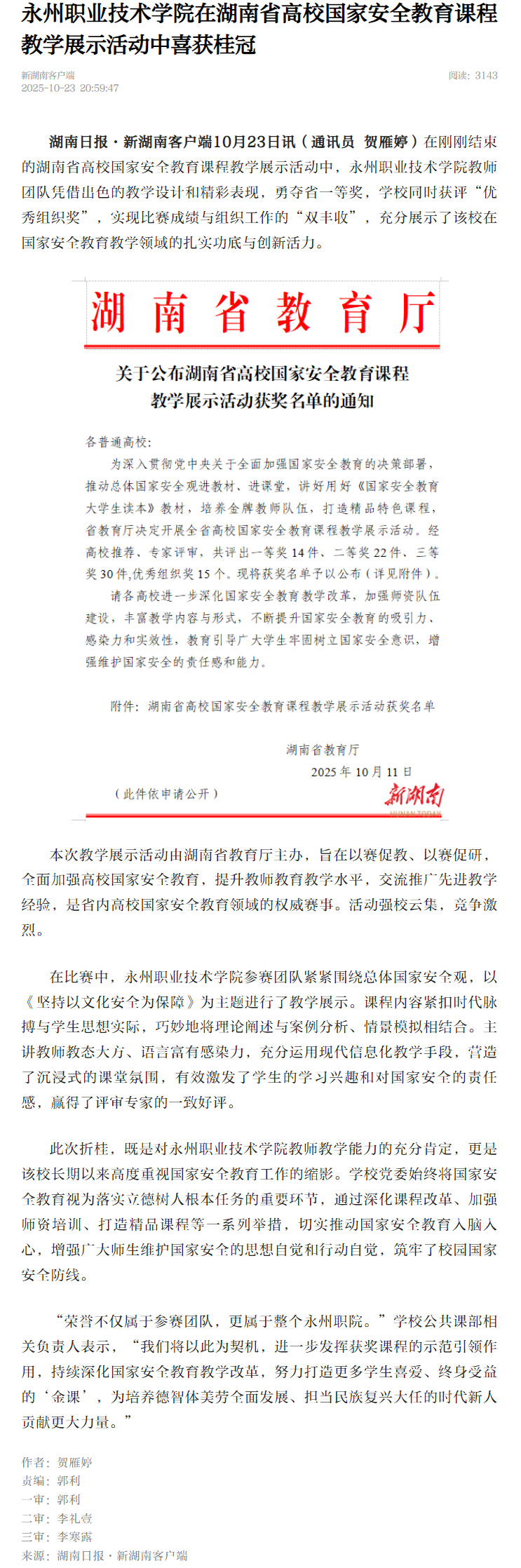 湖南日报·新湖南客户端10月23日讯(通讯员贺雁婷)在刚刚结束的湖南省高校国家安全教育课程教学展示活动中,永州职业技术学院教师团队凭借出色的教学设计和精彩表现,勇夺省一等奖,学校同时获评“优秀组织奖”,实现比赛成绩与组织工作的“双丰收”,充分展示了该校在国家安全教育教学领域的扎实功底与创新活力。