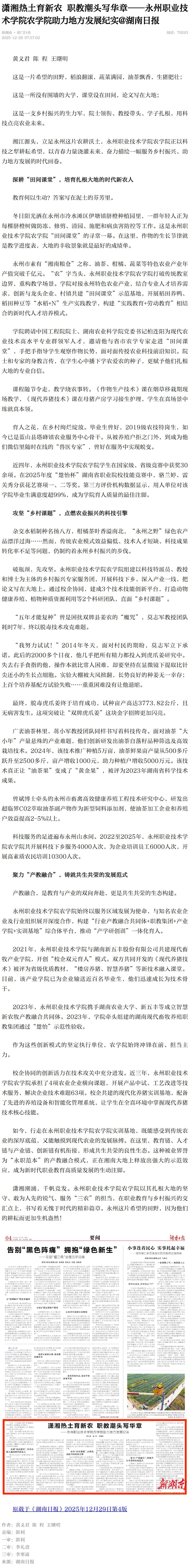 潇湘潮涌,千帆竞发。永州职业技术学院农学院以其扎根大地的坚守、敢为人先的锐气、服务“三农”的担当,在职业教育与乡村振兴的交汇点上,书写着无愧于时代的精彩篇章。永州这片希望的田野,因为他们的耕耘而更加生机盎然!