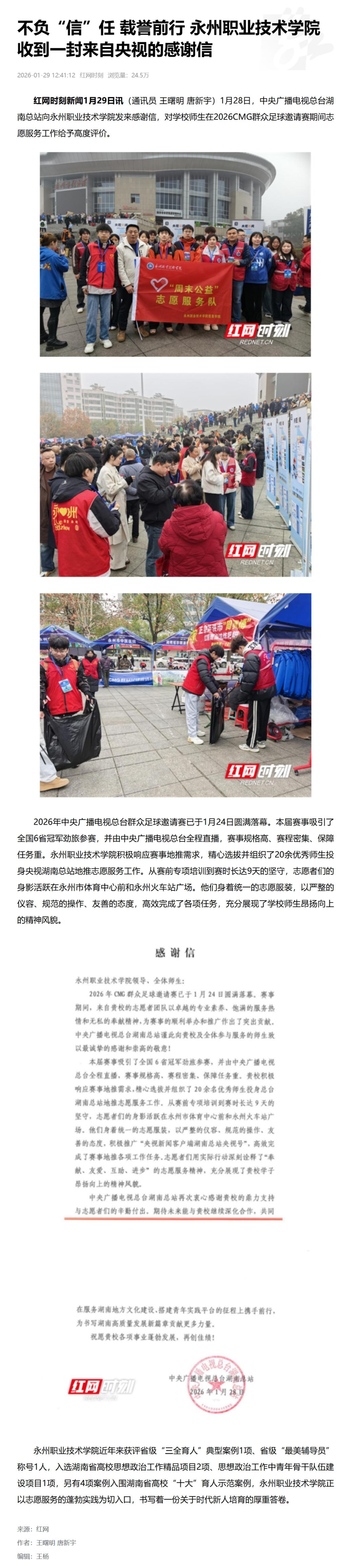 红网时刻新闻1月29日讯(通讯员 王曙明 唐新宇)1月28日,中央广播电视总台湖南总站向永州职业技术学院发来感谢信,对学校师生在2026CMG群众足球邀请赛期间志愿服务工作给予高度评价。
