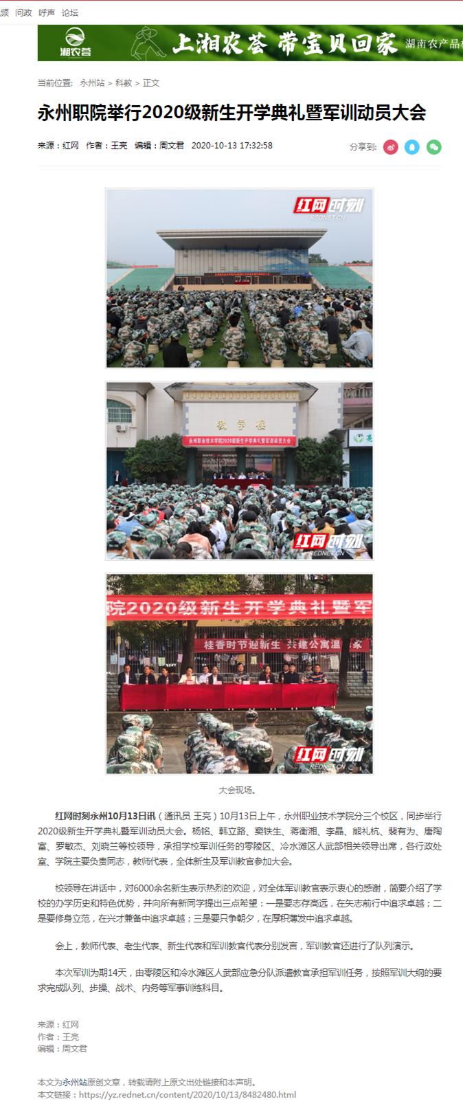 红网时刻永州10月13日讯(通讯员 王亮)10月13日上午,永州职业技术学院分三个校区,同步举行2020级新生开学典礼暨军训动员大会。杨铭、韩立路、窦铁生、蒋衡湘、李晶、熊礼杭、裴有为、唐陶富、罗敏杰、刘晓兰等校领导,承担学校军训任务的零陵区、冷水滩区人武部相关领导出席,各行政处室、学院主要负责同志,教师代表,全体新生及军训教官参加大会。