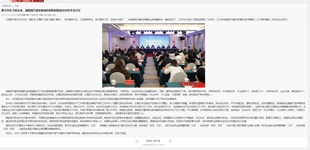 三湘都市报1月10日讯(通讯员 王曙明 记者 刘镇东 黄京)“贴近畜牧行业、打造品牌专业、践行服务三农、助推乡村振兴”,在湖南现代畜牧养殖职业教育集团这一建设目标下,2020年又做出了哪些成绩呢?1月8日,2020年湖南现代畜牧养殖职业教育集团(以下简称集团)年会在永州召开。