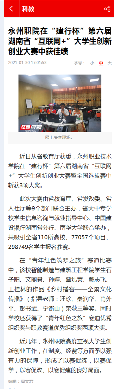 近日从省教育厅获悉,永州职业技术学院在“建行杯”第六届湖南省“互联网+”大学生创新创业大赛暨全国选拔赛中斩获3项大奖。