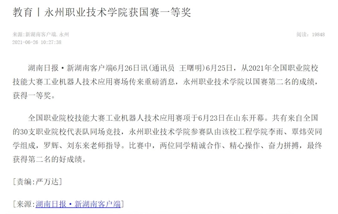 湖南日报·新湖南客户端6月26日讯(通讯员 王曙明)6月25日,从2021年全国职业院校技能大赛工业机器人技术应用赛场传来重磅消息,永州职业技术学院以国赛第二名的成绩,获得一等奖。