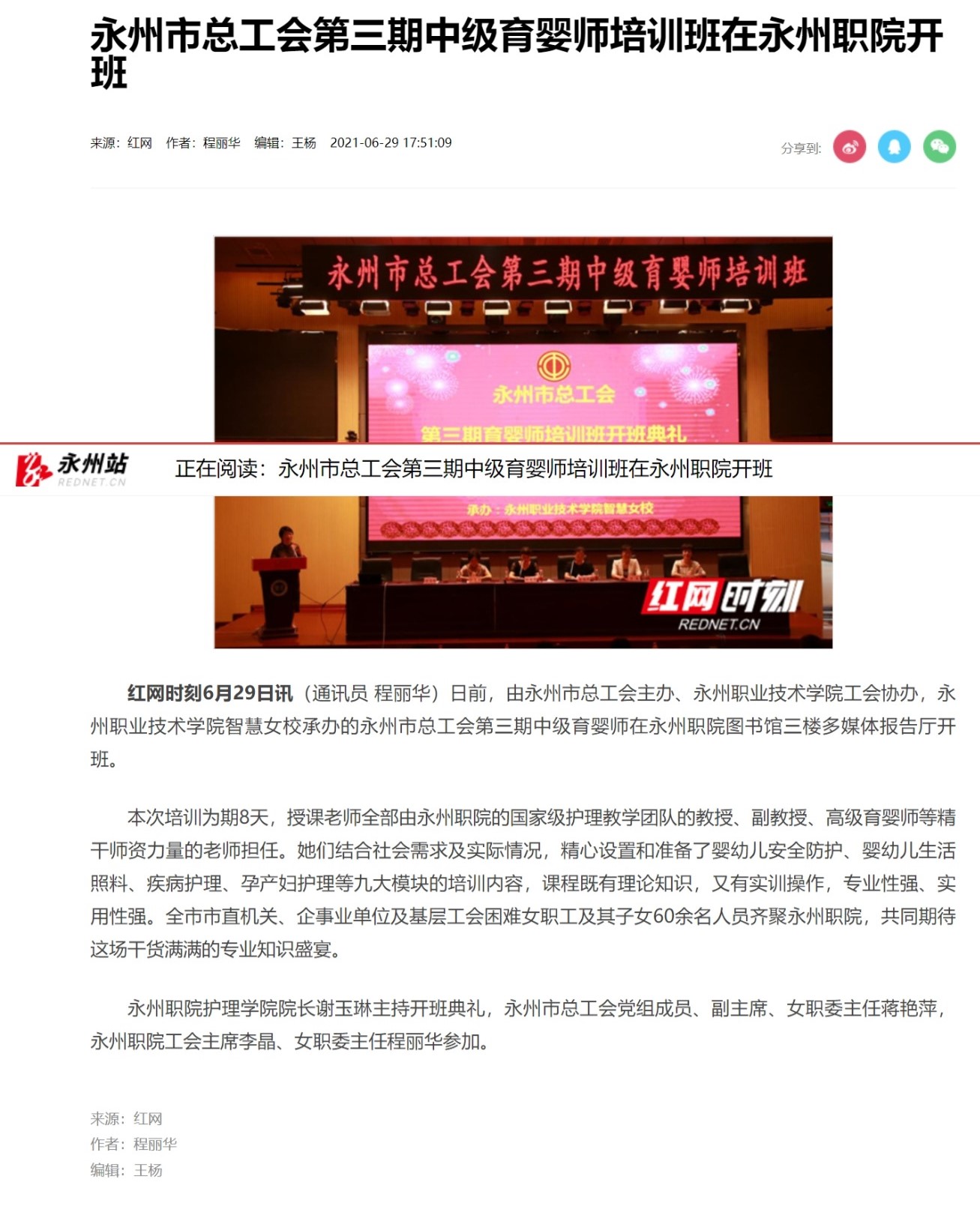 红网时刻6月29日讯(通讯员 程丽华)日前,由永州市总工会主办、永州职业技术学院工会协办,永州职业技术学院智慧女校承办的永州市总工会第三期中级育婴师在永州职院图书馆三楼多媒体报告厅开班。
