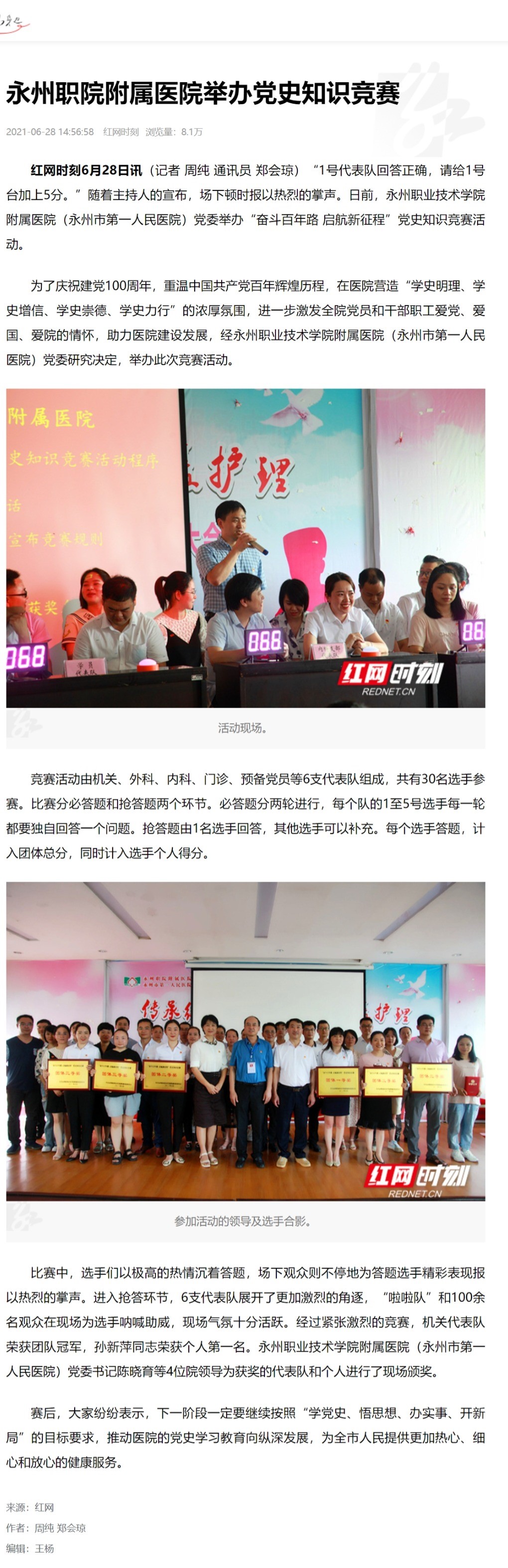 为了庆祝建党100周年,重温中国共产党百年辉煌历程,在医院营造“学史明理、学史增信、学史崇德、学史力行”的浓厚氛围,进一步激发全院党员和干部职工爱党、爱国、爱院的情怀,助力医院建设发展,经永州职业技术学院附属医院(永州市第一人民医院)党委研究决定,举办此次竞赛活动。
