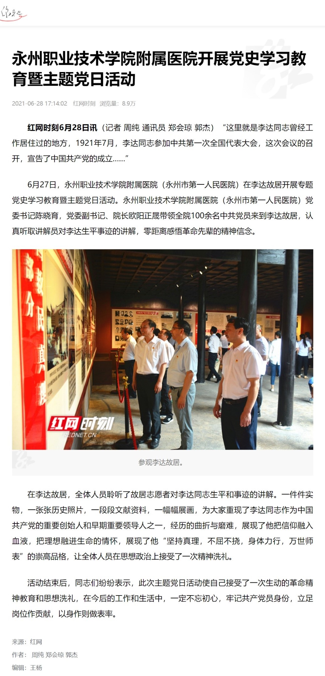 【红网】永州职业技术学院附属医院开展党史学习教育暨主题党日活动