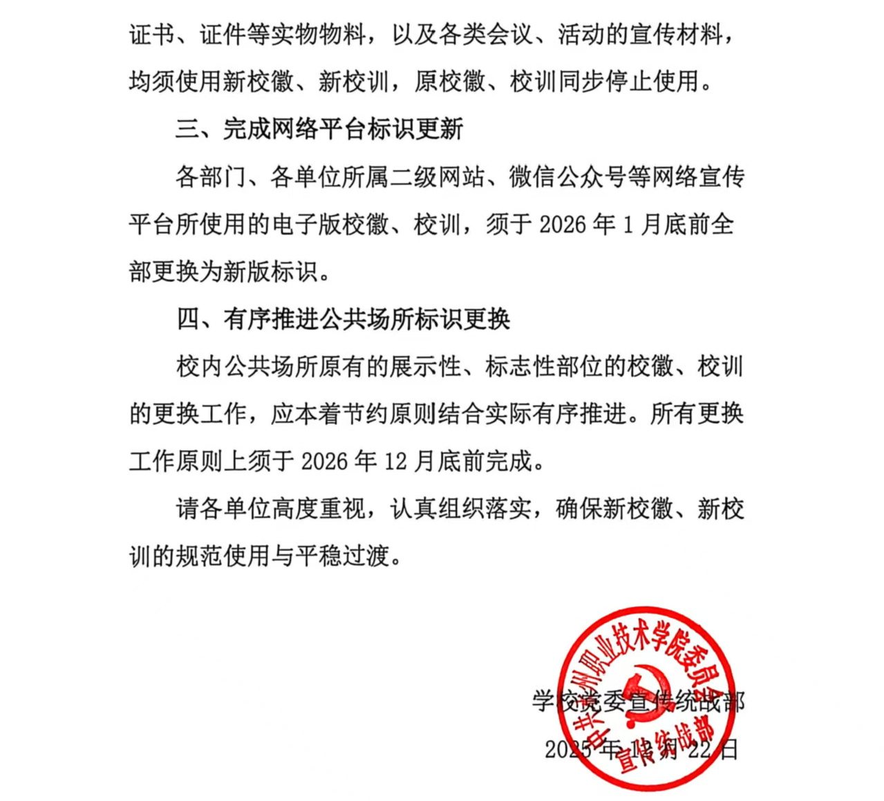 校内公共场所原有的展示性、标志性部位的校徽、校训的更换工作,应本着节约原则结合实际有序推进。所有更换工作原则上须于2026年12月底前完成。
