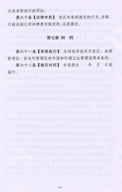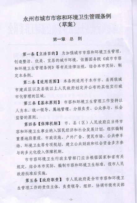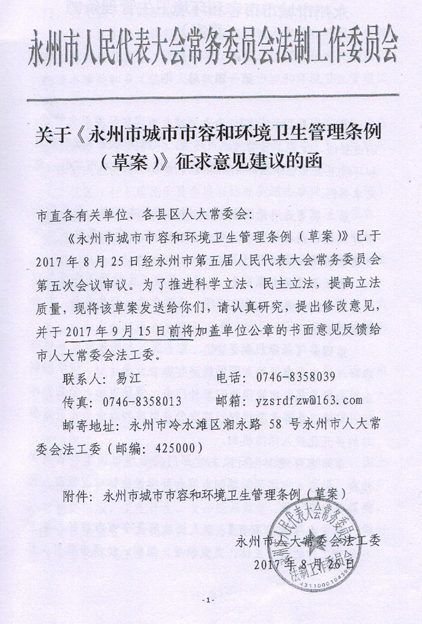 现将《永州市城市市容和环境卫生管理条例(草案)》挂在网上,征求大家意见,请大家提出修改意见或建议,于2017年9月14日前以文档的形式发宣传统战部邮箱(yzzyxtb@163.com),我们将收集的意见汇总报市人大常委会法工委。