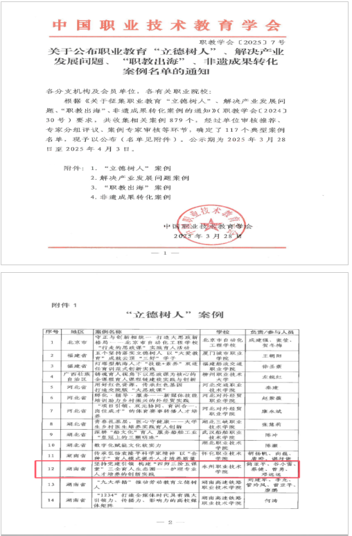 近日,中国职业技术教育学会公布《职业教育“立德树人”、解决产业发展问题、“职教出海”、非遗成果转化案例》典型案例名单,我校护理学院简亚平等人撰写的《坚持党建引领,构建“四师三阶五课堂”三全育人生态圈——护理专业人才培养的创新实践》的成功入选“立德树人”案例。