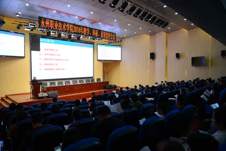 4月17日下午,永州职业技术学院2018年教学、科研、质量监控会议在院本部图书馆三楼学术报告厅召开,会议由学院副院长韩立路主持,学院党委书记黄小明,党委副书记、院长翟惠根,院领导窦铁生、蒋衡湘、王中军、熊礼杭、裴有为、唐陶富、罗敏杰、刘晓兰出席会议,