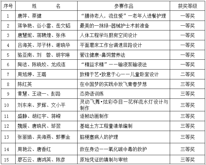我院共选派思政(德育)、教学设计、课堂教学、实训教学等4个赛项共16个作品(中职2个,高职14个)参赛,共有15件作品获奖。其中,护理系唐萍、蔡健老师主持的《“膳待老人,流住爱”—老年人进餐护理》作品荣获高职实训组一等奖,并代表湖南省参加该项目的国赛,全省高职组只有19件作品推荐参加国赛。护理系蒋争艳、谷小雷、岳文韬老师主持的作品《最美的一抹绿-器械护士术前准备》和建筑工程系唐慧妮、蒋聘煌、张伟老师主持的作品《人体工程学与厨房空间设计》荣获高职教学设计组一等奖,机械工程系吕海英、邓子林、谢晓华老师主持的《平面磨床工作台调速回路设计》荣获高职课堂教学组一等奖。护理系骆亚南、刘 蓉、胡宇琳老师主持的《管注健康-鼻饲营养法》作品荣获中职教学设计组一等奖。陶洁、陈晓姣、龙成连老师主持的作品《“精益求精”——输液泵输液法》荣获中职实训教学组一等奖。建筑工程系周旭婷、王璐老师主持的作品《致精于艺?致意于心——儿童卧室设计》荣获高职课堂教学组二等奖。陈红英等老师主持的8个作品获高职组三等奖。