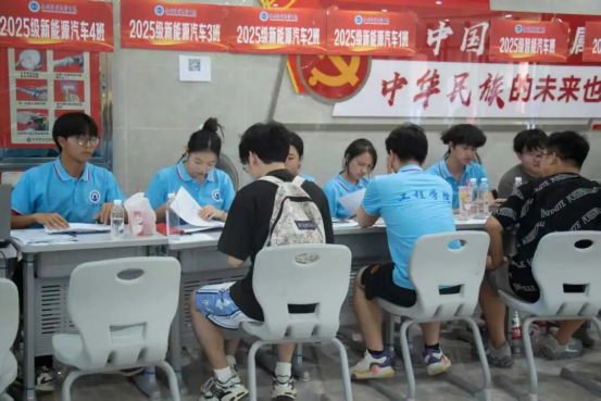 为了迎接新生的到来,学长们早早的布置了场地,以便新同学们更便捷的找到自己班级的报到处。