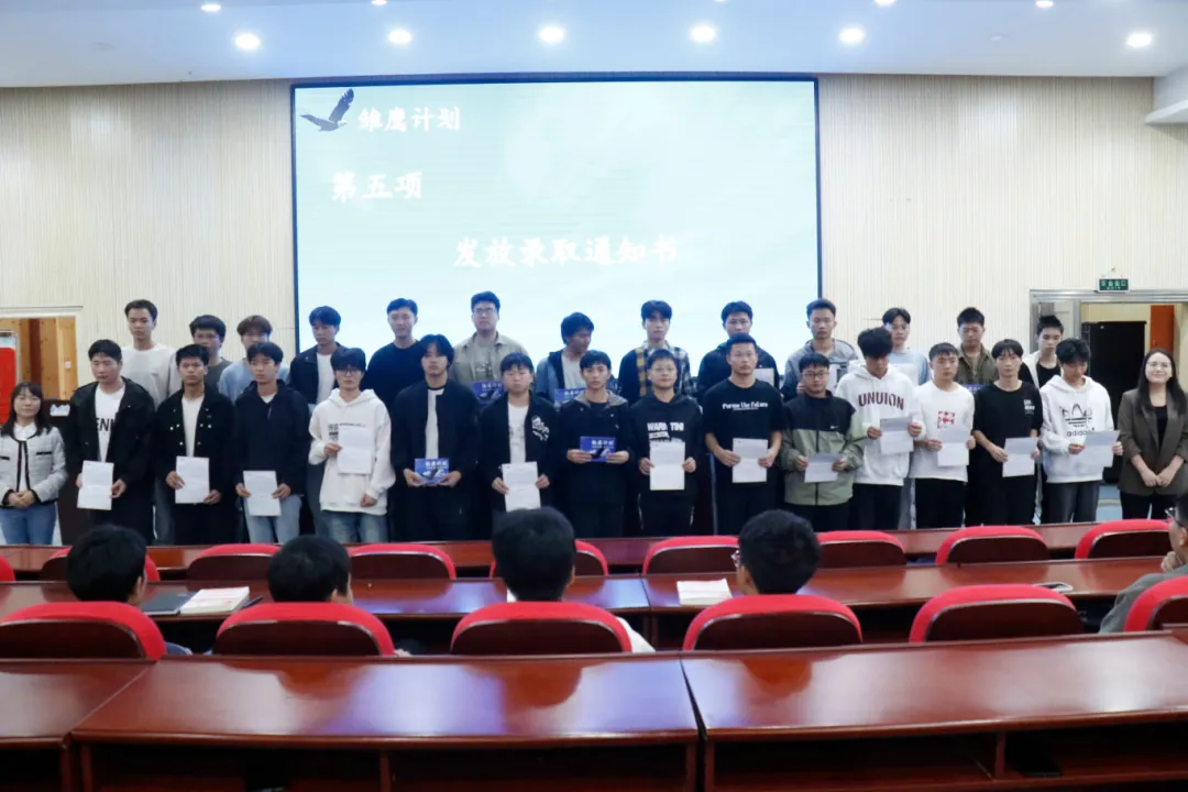 工程学院学工科主任肖丽娟和蓝思科技王帅向龙俊齐等学生发放录取通知书,这一张张通知书承载着同学们的梦想和希望,也标志着他们正式成为 “雏鹰计划蓝思班” 的一员,踏上技能提升与职业发展的新旅程。